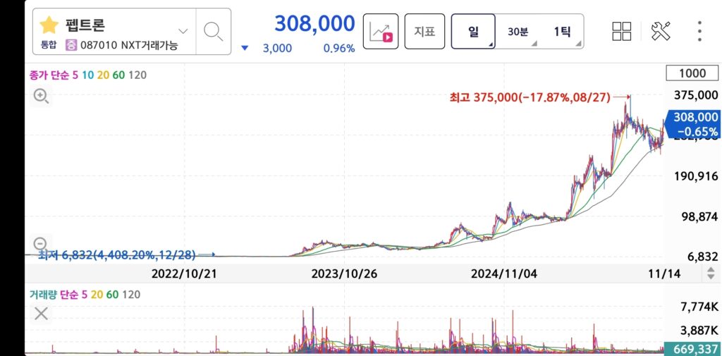 펩트론은 GLP-1 기반 비만·당뇨 치료제 관련 기술을 보유한 기업으로, 지속형 약물 플랫폼이 글로벌 시장에서 높은 평가를 받고 있습니다.