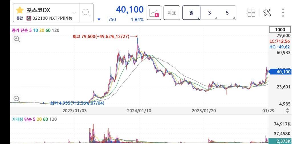 요즘 증시에서 AI, 로봇, 자동화 테마만 나오면 반응하는 종목이 하나 있다. 바로 포스코DX(022100)다. 2026년 1월 들어서만 52주 신고가를 연달아 경신하며 4만 원을 돌파했다. 1년 전만 해도 1만 원대 후반에서 거래되던 주가가 말이다.